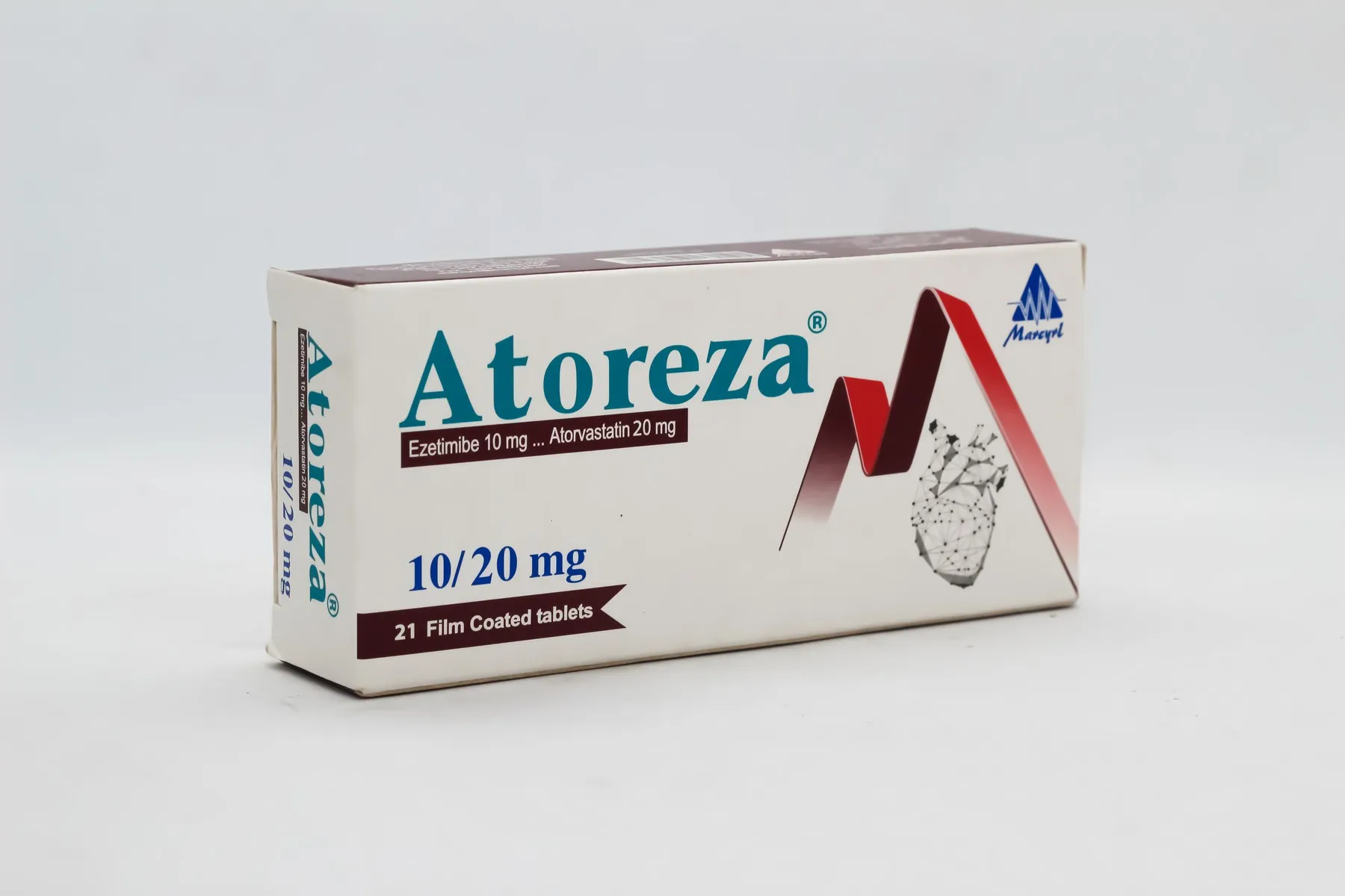 Atoreza 10/20 mg هو دواء يُستخدم لخفض مستوى الكوليسترول والدهون الضارة في الدم. يحتوي على مزيج من مادتين فعالتين هما Atorvastatin و Ezetimibe، ويعملان معًا على تقليل إنتاج الكوليسترول في الكبد وتقليل امتصاصه من الأمعاء.