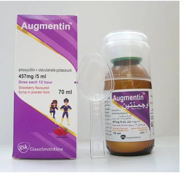 أوجمنتين Augmentin 457 مجم هو مسحوق لعمل شراب معلق عن طريق الفم يحتوي على أموكسيسيلين و حمض كلافولانيك بتركيز 457 مجم. يُستخدم لعلاج العديد من العدوى البكتيرية مثل التهابات الجهاز التنفسي العلوي والسفلي، التهاب الأذن الوسطى، التهابات الجيوب الأنفية، وبعض التهابات الجلد والمسالك البولية. يتم تحضير الشراب بإضافة الماء وفقًا للتعليمات، ويُؤخذ تحت إشراف الطبيب. العبوة تحتوي على 70 مل من الشراب المعلق.