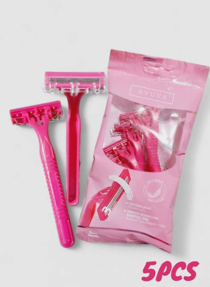 افوفا | Avuva ماكينات حلاقة نسائية 3 شفرات توفر حلاقة ناعمة وآمنة للبشرة، العبوة تحتوي على 5 قطع لتوفير الراحة والفعالية في كل استخدام.