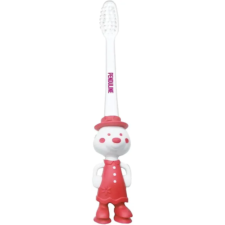 فرشاة أسنان بندولين للأطفال بتصميم أحمر في أبيض، شعيرات ناعمة ولطيفة تساعد على تنظيف أسنان الأطفال بلطف وأمان.