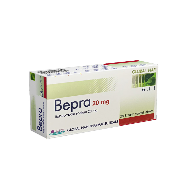 دواء Bepra 20 mg يحتوي على المادة الفعالة Rabeprazole Sodium، وهي من مثبطات مضخة البروتون (PPIs) التي تعمل على تقليل إفراز حمض المعدة بشكل فعال.