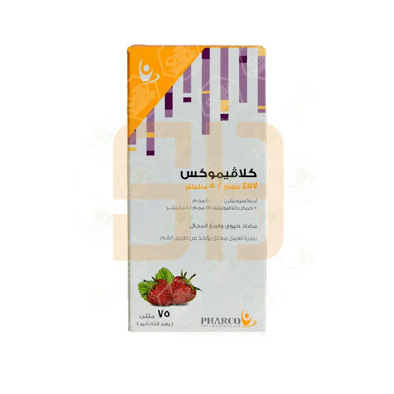 كلافيموكس شراب 457 مجم/5 مل معلق فموي مضاد حيوي واسع المدى لعلاج التهابات الجهاز التنفسي والأذن والجيوب الأنفية لدى الأطفال.