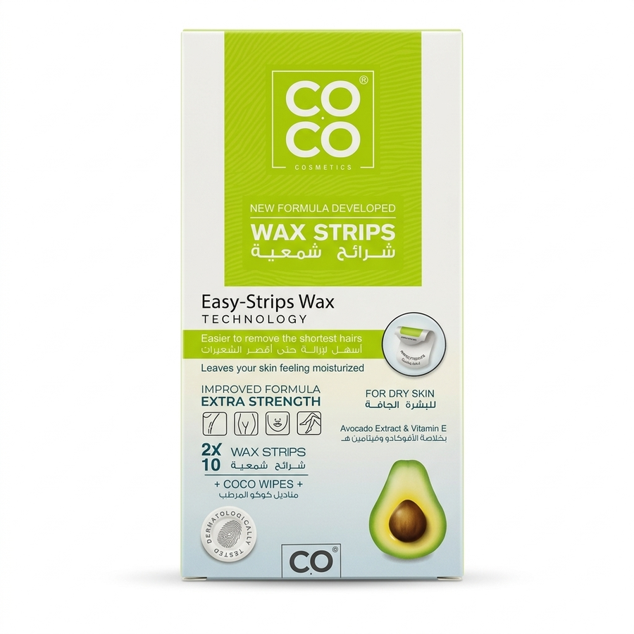 Coco Wax Hair Removal Strips هي شرائح شمعية مخصصة لإزالة الشعر بسهولة وفعالية، وتحتوي على خلاصة الأفوكادو والفيتامينات التي تساعد على تغذية وترطيب البشرة، مما يجعلها مناسبة بشكل خاص للبشرة الجافة.
