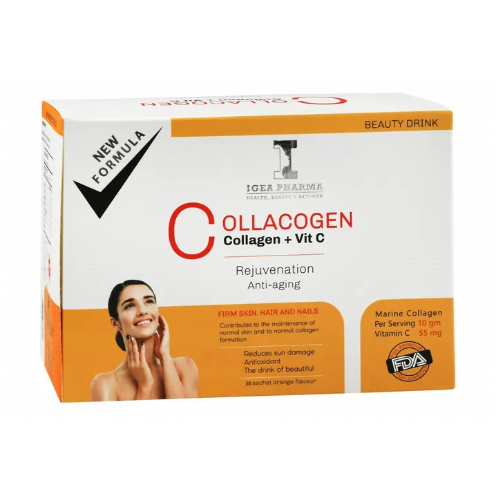 كولاكوجين أكياس تحتوي على كولاجين بحري وفيتامين سي لعلاج مشكلات البشرة وزيادة نضارتها وعلاج التجاعيد والهالات السوداء وصحة الخدود والشفايف والحفاظ على الشعر ومنع تساقط الشعر وعلاج هشاشة العظام والأظافر.