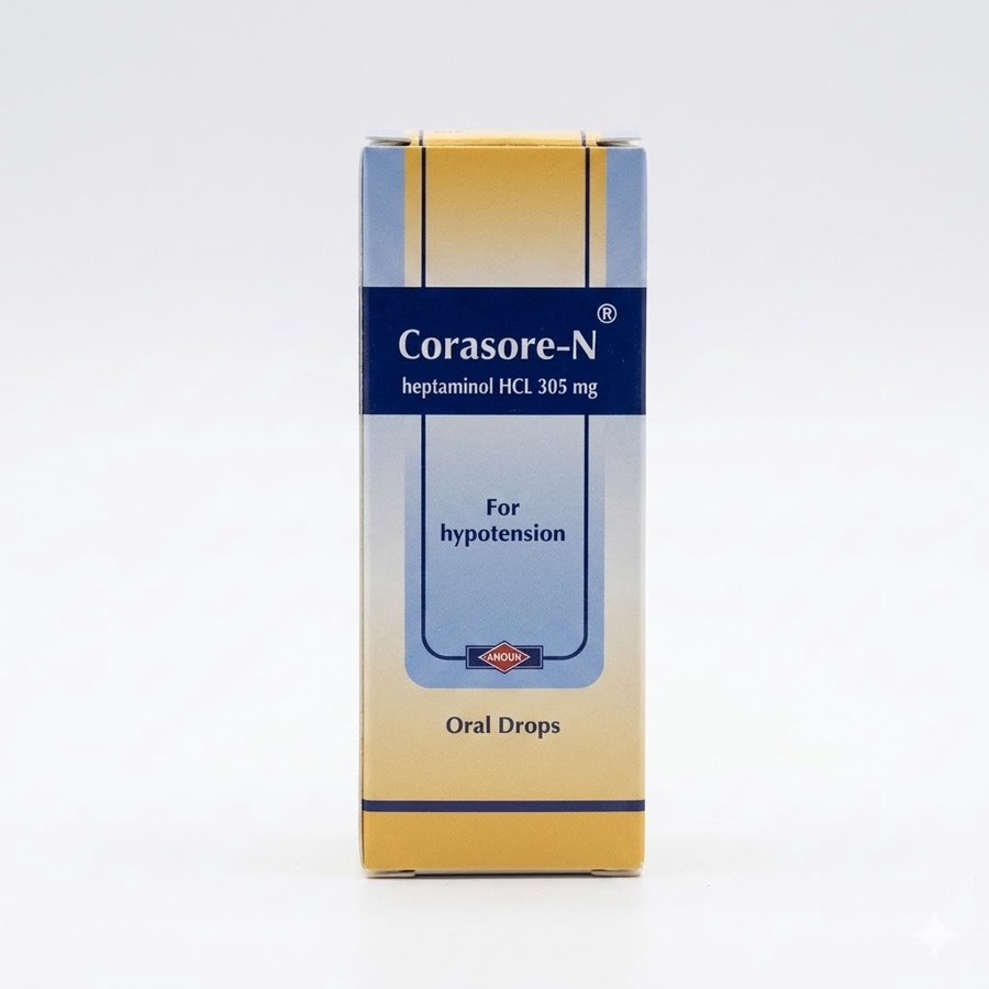 نقط Corasore N Oral Drops تحتوي على المادة الفعالة Heptaminol 305 mg/ml، وتُستخدم لعلاج انخفاض ضغط الدم وتحسين الدورة الدموية.
