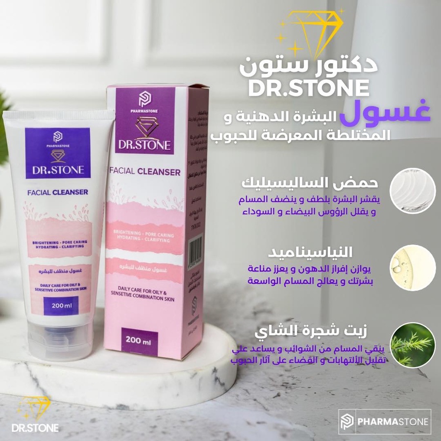 غسول دكتور ستون للبشرة الدهنية والمختلطة، ينظف المسام بعمق ويزيل الدهون الزائدة، يحتوي على حمض السالسيليك وزيت شجرة الشاي.