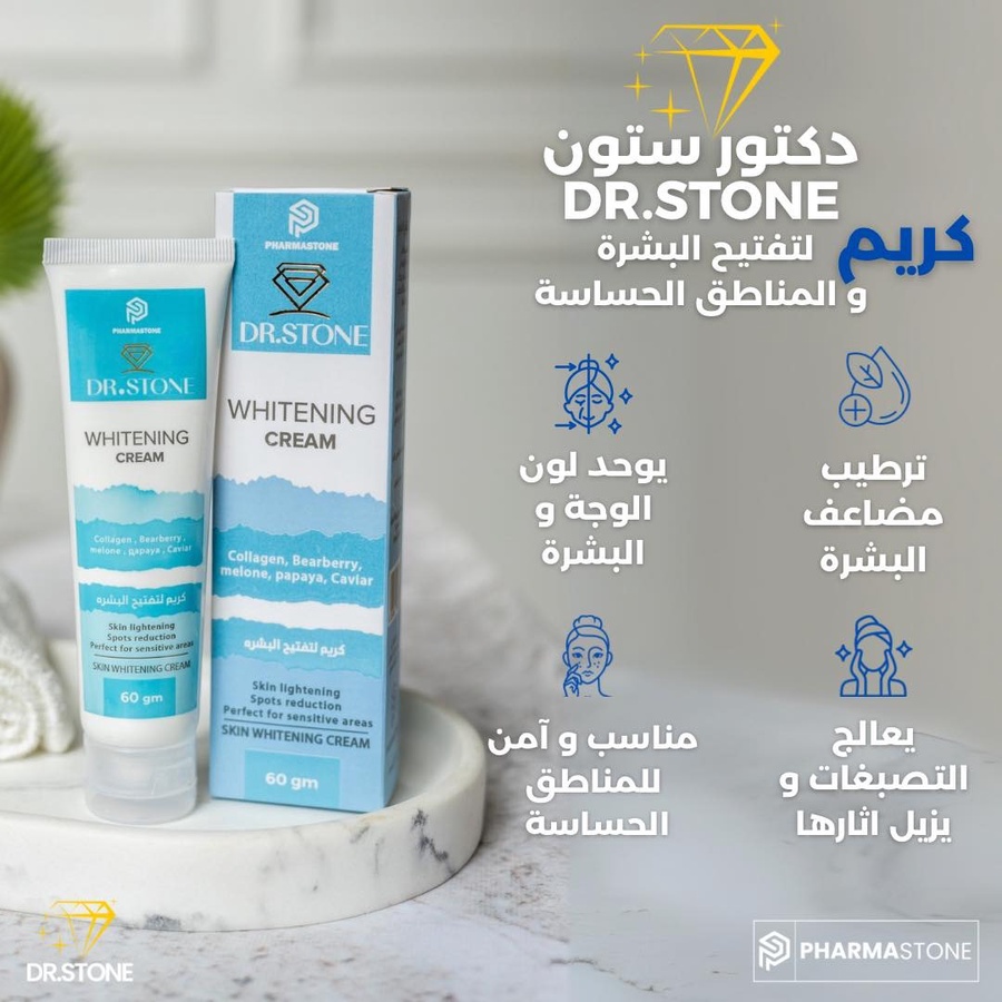 كريم دكتور ستون لتفتيح البشرة يعيد للبشرة إشراقتها ويعمل على توحيد لونها. يحتوي على مكونات طبيعية مثل الكولاجين والتوت البري والبابايا والكافيار، ويتميز بتركيبته الفعّالة في تفتيح البشرة وعلاج التصبغات في المناطق الحساسة، مع ترطيب البشرة وتنقيتها.