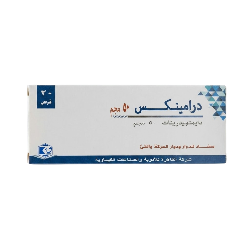 درامينكس أقراص تحتوي على دايمنهيدرينات لعلاج دوار الحركة والغثيان أثناء السفر، فعالة للسيارة والطائرة وتساعد على تقليل القيء والدوخة.