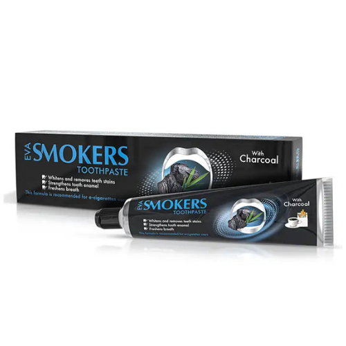معجون Eva Smokers بالفحم يزيل تصبغات الأسنان، يساعد على التبييض، يقوي الأسنان ويحمي من التسوس مع نفس منعش يدوم طويلًا.