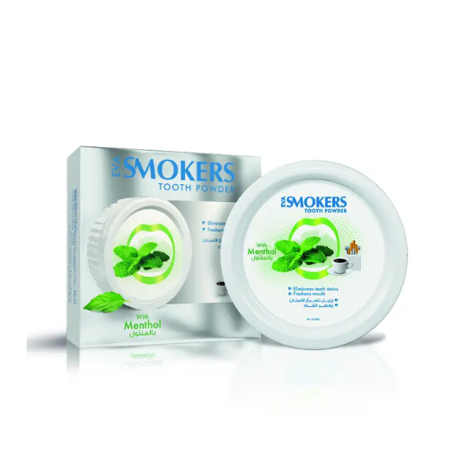 بودرة Eva Smokers بالمنتول تساعد على إزالة تصبغات الأسنان وتنظيفها بعمق، مع منح نفس منعش يدوم طويلًا. مناسبة للمدخنين.