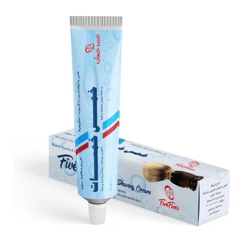 كريم حلاقة Five Fives بزيت جوز الهند والجلسرين يمنح حلاقة ناعمة، يرطب البشرة ويقلل التهيج مع إحساس منعش بالمنتول.