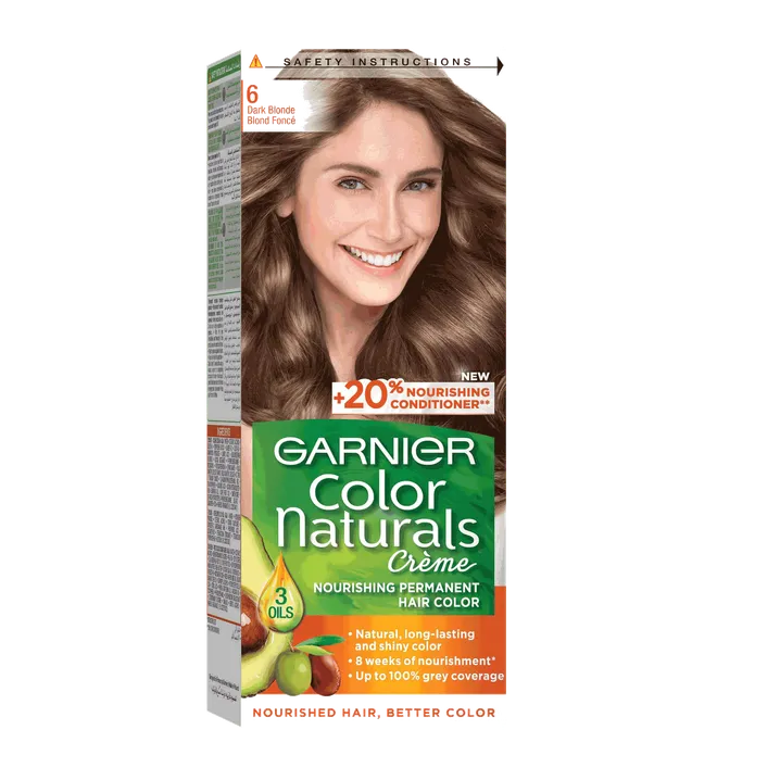 صبغة غارنييه كولور ناتشرالز كريم 6 أشقر غامق تمنح لونًا طبيعيًا متوازنًا مع تغطية فعالة للشيب ولمعان يدوم.