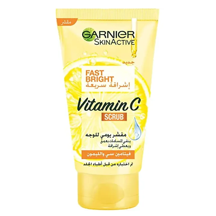 مقشر غارنييه فاست برايت بفيتامين C يساعد على إزالة الجلد الميت، تفتيح البشرة وتقليل البهتان مع إشراقة ونعومة ملحوظة.