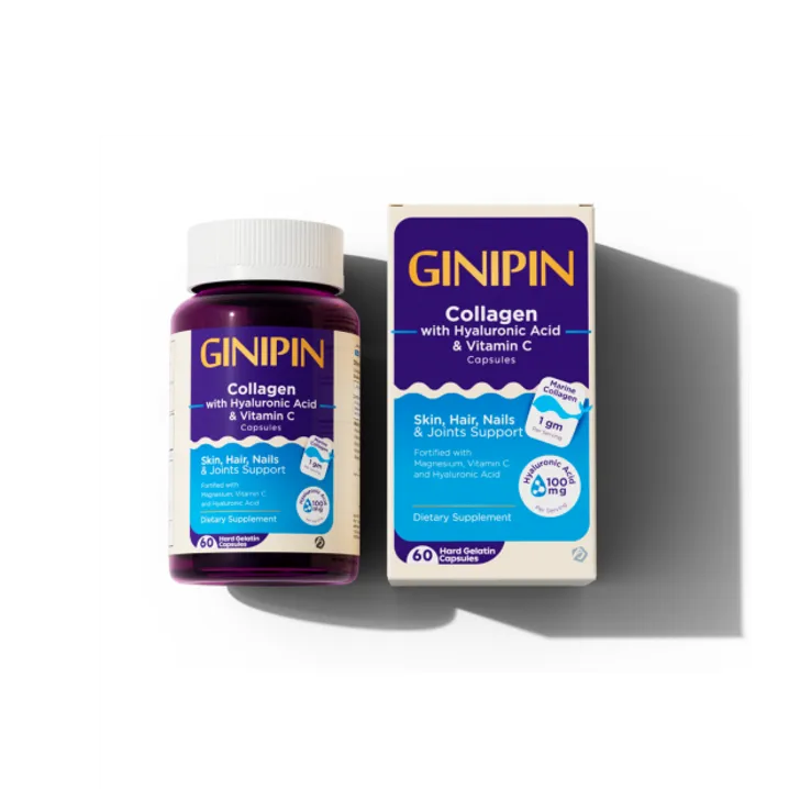 جينيبين مكمل غذائي يحتوي على كولاجين وهيالورونيك أسيد وفيتامين سي لدعم نضارة البشرة، مرونتها، وصحة الشعر والأظافر.