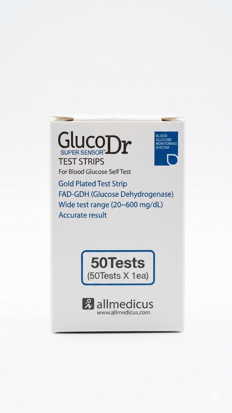 شرائط قياس السكر GlucoDr Super Sensor Test Strips تُستخدم لقياس مستوى الجلوكوز في الدم بدقة وسهولة، وهي مصممة للاستخدام مع أجهزة قياس السكر من سلسلة GlucoDr Blood Glucose Monitoring System.