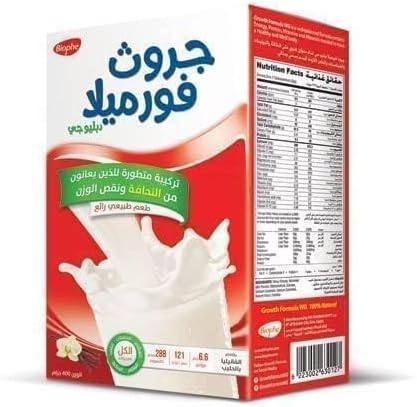 جروث فورميولا بنكهة الفانيليا 400 جرام تركيبة نمو متوازنة تحتوي على البروتينات والفيتامينات لدعم النمو السليم والتغلب على سوء التغذية وضعف الشهية.