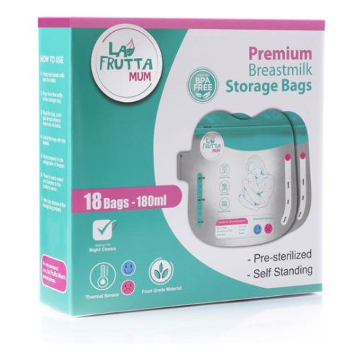 لا فروتا أكياس تخزين حليب الأم 180 مل، 18 قطعة، معقمة مسبقًا، آمنة للفريزر وخالية من BPA مع قفل محكم لمنع التسرب.