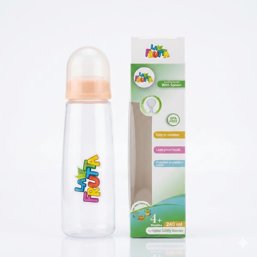 زجاجة La Frutta Feeding Bottle with Silicone Spoon مصممة لتسهيل عملية التغذية المبكرة للأطفال من عمر 4 أشهر وما فوق. تتميز بملعقة سيليكون ناعمة لطيفة على لثة الطفل أثناء إدخال الأطعمة الصلبة اللينة والحبوب، مع تصميم زجاجة قابلة للضغط للتحكم في تدفق الطعام بسهولة وسلاسة.