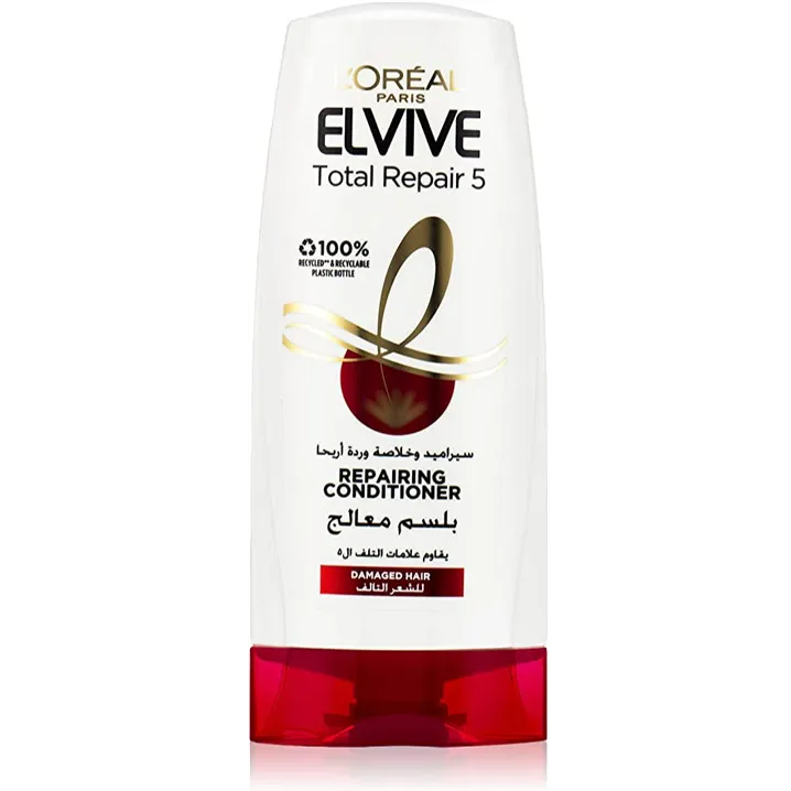 بلسم لوريال باريس إلفيف توتال ريبير 5 لتغذية الشعر التالف، يساعد على تقليل التقصف والهيشان ويمنح نعومة ولمعانًا صحيًا.