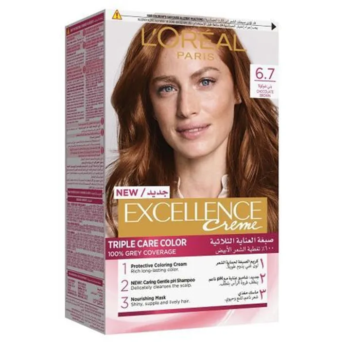 صبغة لوريال باريس إكسيلانس كريم بلون بني شوكولاتة 6.7، تمنح لونًا دافئًا غنيًا مع تغطية فعالة للشيب ولمعان صحي.