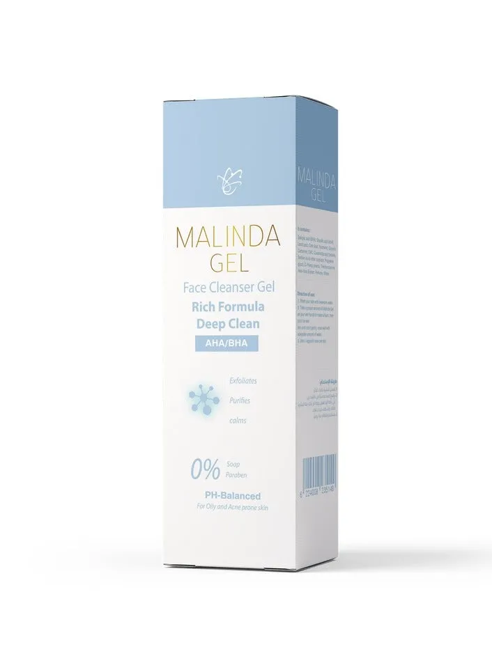 ماليندا غسول الوجه 250 مل ينظف البشرة بلطف ويزيل الزيوت والشوائب دون تجفيف، مناسب للبشرة العادية والحساسة للاستخدام اليومي.