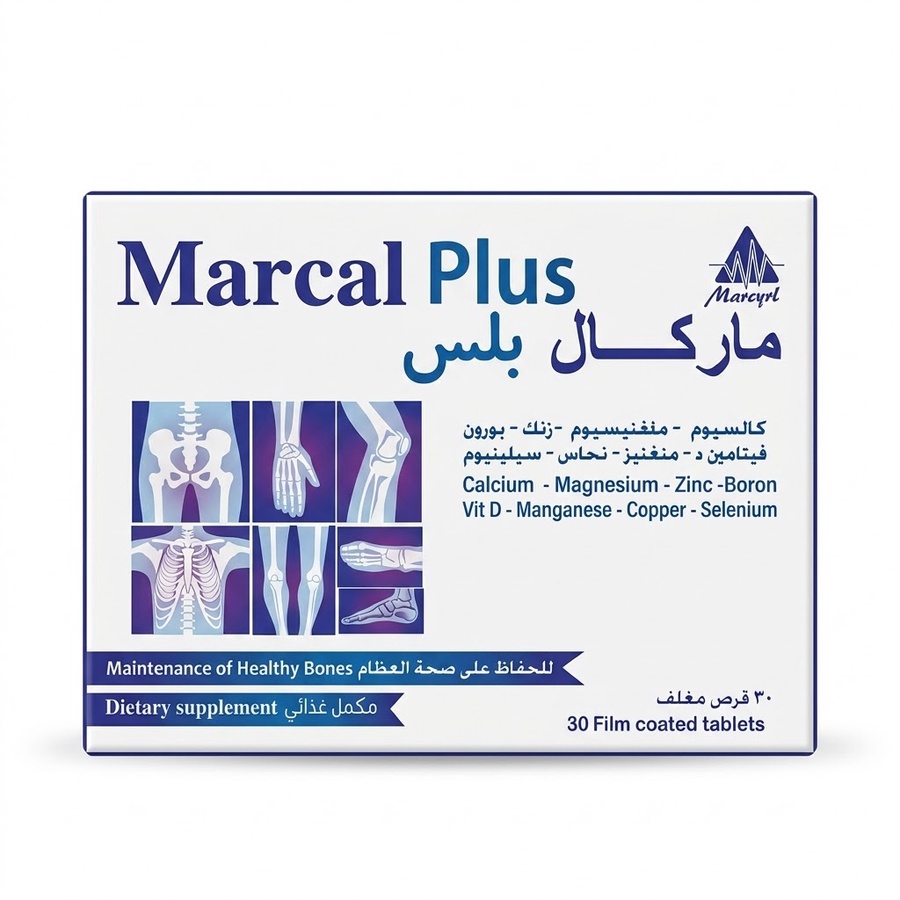 Marcal Plus هو مكمل غذائي متكامل مصمم لدعم صحة العظام والأسنان وتعويض نقص فيتامين د. يحتوي على تركيبة متوازنة من فيتامين D3 بجرعة فعالة مع الكالسيوم والماغنيسيوم، بالإضافة إلى مجموعة من المعادن الهامة مثل الزنك والنحاس والمنجنيز والسيلينيوم والبورون.