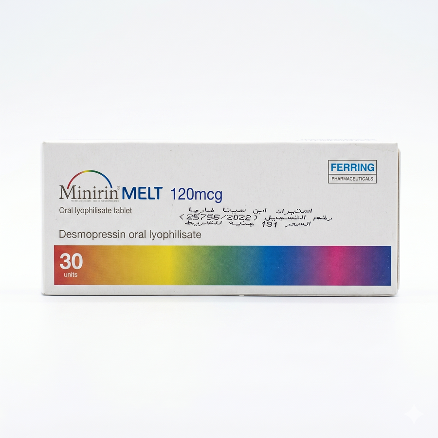 Minirin Melt 120 mcg هو دواء يحتوي على ديسموبريسين (Desmopressin)، وهو بديل لهرمون مضاد لإدرار البول (ADH)، ويُستخدم لتنظيم توازن السوائل في الجسم وتقليل إنتاج البول.