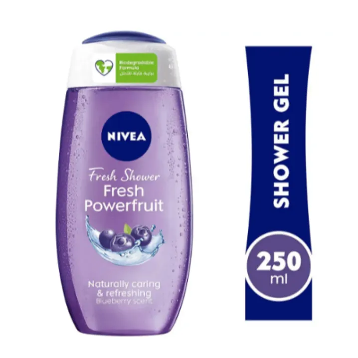 نيفيا شاور جل فريش باور فروت برائحة التوت البري مصمم لتنظيف البشرة بفعالية مع منح إحساس فوري بالانتعاش والحيوية.