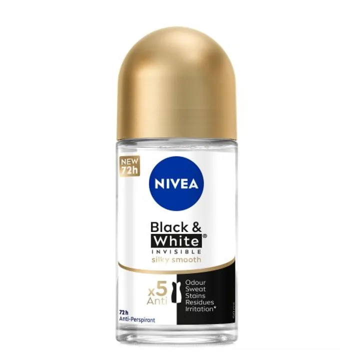 نيفيا مزيل للعرق إنفيزيبل سيلكي سموث للنساء بلاك آند وايت رول أون يوفر حماية موثوقة من الروائح غير المرغوب فيها مع تركيبة مصممة لتقليل العلامات البيضاء على الملابس الداكنة والبقع الصفراء على الملابس الفاتحة.