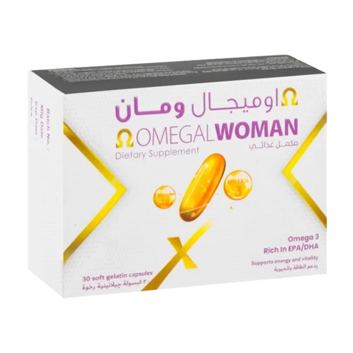 اوميجال ومان Omegal Woman 30 كبسولة مكمل غذائي أوميجا 3 يدعم صحة القلب والمخ والعيون، ويساعد على دعم النشاط وتوازن الدهون ضمن نمط حياة صحي.
