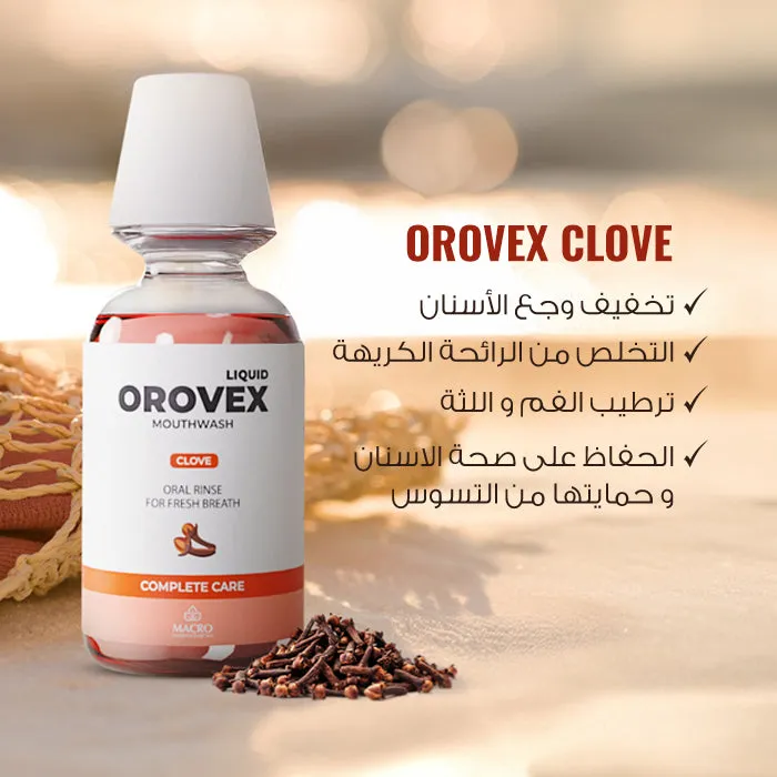 أوروفيكس غسول فم بالقرنفل يساعد في تخفيف ألم الأسنان، تقليل البلاك والجير والبقع، يدعم الوقاية من التسوس ويمنح نفسًا منعشًا.
