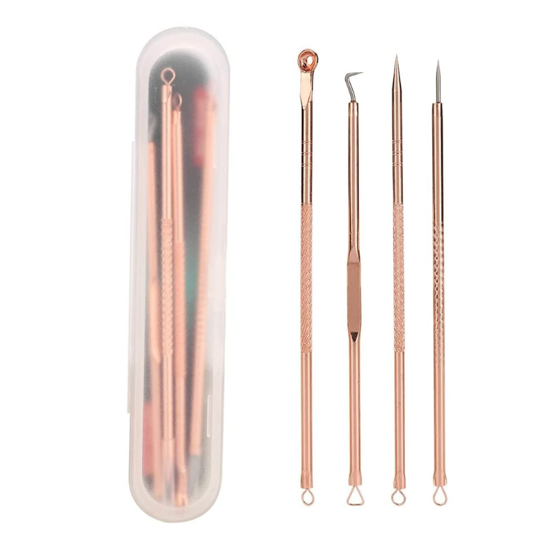 طقم إزالة الرؤوس السوداء 4 في 1 من Pink Line مصنوع من ستانلس ستيل طبي، يساعد على إزالة الحبوب والرؤوس السوداء بدقة وأمان مع تصميم احترافي.