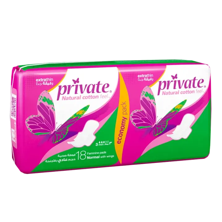 فوط نسائية برايفت رقيقة عادي، توفر حماية خفيفة ومريحة مع امتصاص مناسب للاستخدام اليومي أثناء الدورة الشهرية.