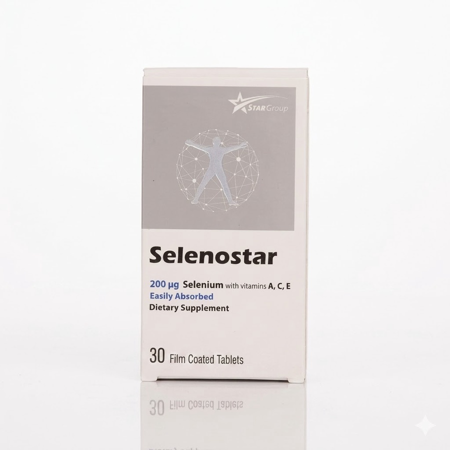 سيلينوستار مكمل غذائي يحتوي على فيتامين A وC وE والسيلينيوم لدعم الخصوبة وصحة الغدة الدرقية وتعزيز المناعة.