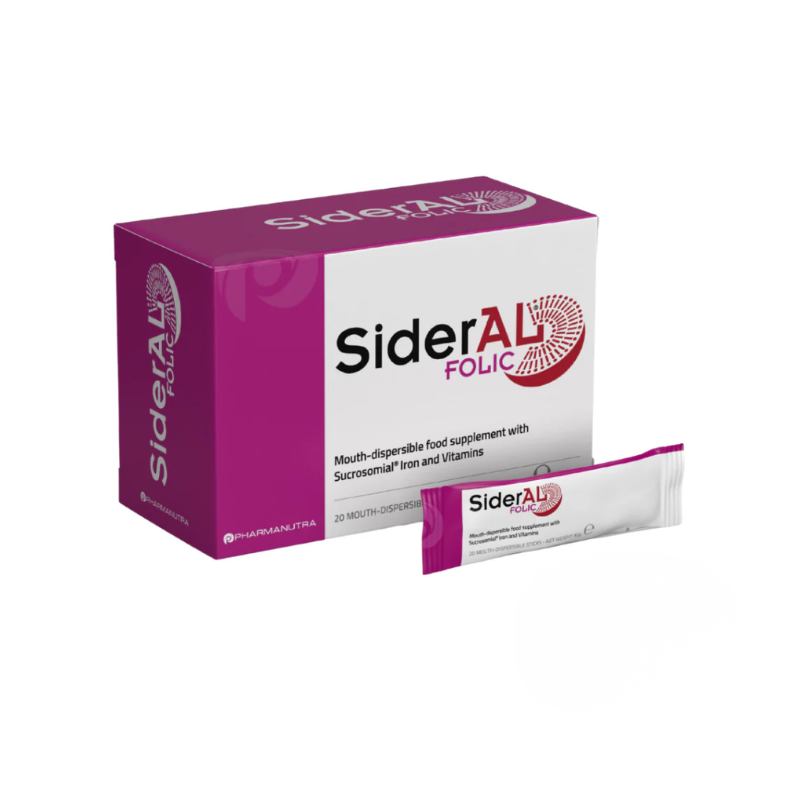 Sideral Folic Mouth Dispersible 20 Sticks هو مكمل غذائي متطور للنساء من جميع الأعمار، يحتوي على الحديد السكروزومي (Sucrosomial® Iron) الذي يتم امتصاصه بسهولة في الأمعاء دون التأثير على المعدة، مما يقلل الغثيان والإمساك والطعم المعدني غير المرغوب.