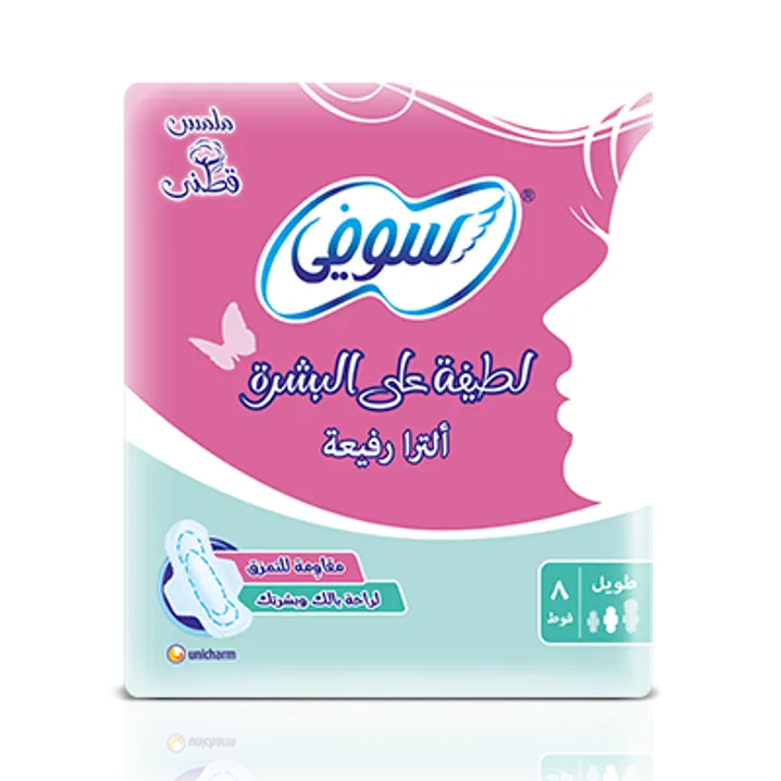 فوط قطنية سوفي رفيعة جدًا طويلة بالأجنحة مصممة لتوفير حماية خفيفة ومريحة خلال فترة الدورة الشهرية مع إحساس ناعم ولطيف على البشرة.