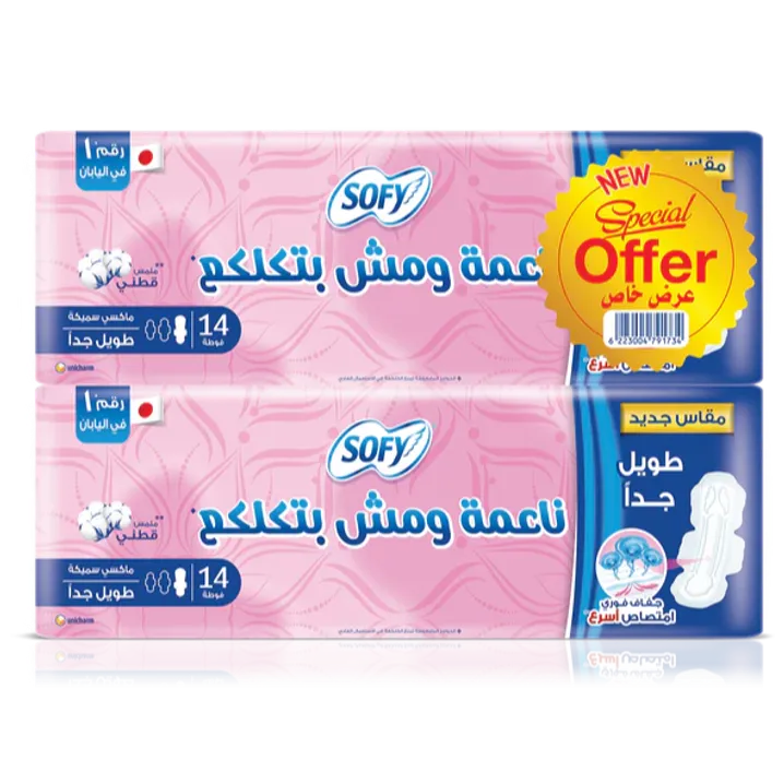 فوط صحية سوفي ماكسي طويلة جدًا مصممة لتوفير حماية فعّالة خلال فترة الدورة الشهرية، خاصة في الأيام التي تتطلب تغطية إضافية وأمانًا أعلى من التسرب.