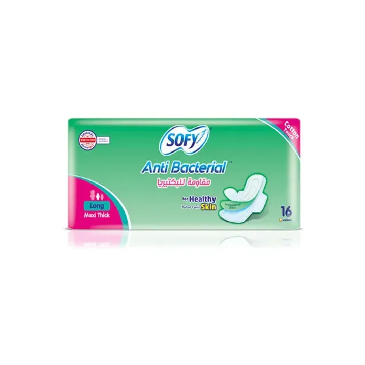 فوط صحية سوفي ماكسي طويلة وسميكة من القطن مضادة للبكتيريا مصممة لتوفير حماية فعّالة وراحة عالية خلال فترة الدورة الشهرية، مع اهتمام خاص بالنظافة والبشرة الحساسة.