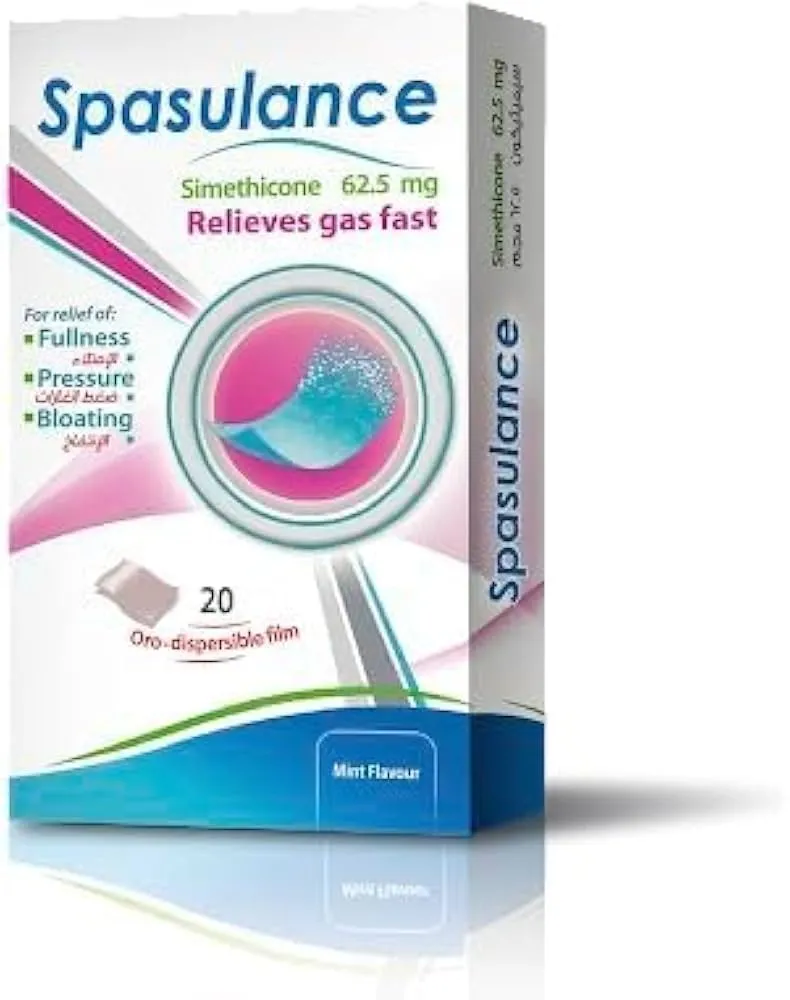 سبازولانس 62.5 مجم 20 شريط فموي ذائب يساعد على تجميع وطرد الغازات وتخفيف الانتفاخ واضطرابات الجهاز الهضمي.