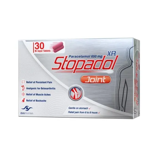 ستوبادول إكس آر جوينت يحتوي على باراسيتامول 650 مجم في صورة ممتدة المفعول (XR)، مصمم لتوفير تسكين طويل الأمد لآلام المفاصل والعضلات. تعمل تقنية الإطلاق الممتد على تحرير المادة الفعالة تدريجيًا، مما يمنح راحة من الألم تدوم من 6 إلى 8 ساعات.
