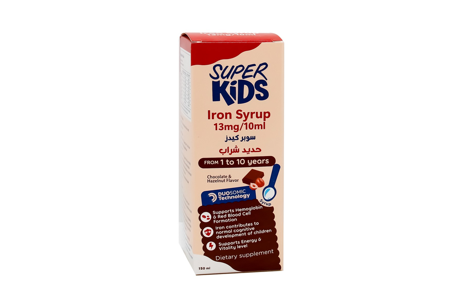 Super Kids Iron Syrup هو مكمل غذائي غني بالحديد مصمم خصيصًا للأطفال من عمر سنة إلى 10 سنوات لدعم تكوين الهيموجلوبين وخلايا الدم الحمراء والوقاية من نقص الحديد.