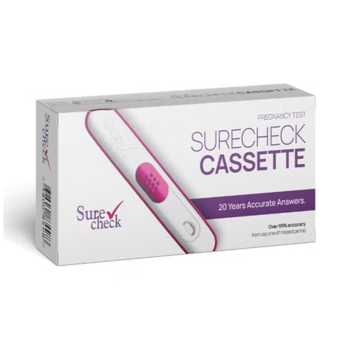 Surecheck Pregnancy Test Cassette هو اختبار حمل منزلي دقيق وسهل الاستخدام، يعتمد على تقنية Colloidal Gold للكشف عن هرمون الحمل (hCG) بدقة عالية. يوفر نتائج موثوقة تتجاوز 99% عند استخدامه من أول يوم لتأخر الدورة الشهرية.