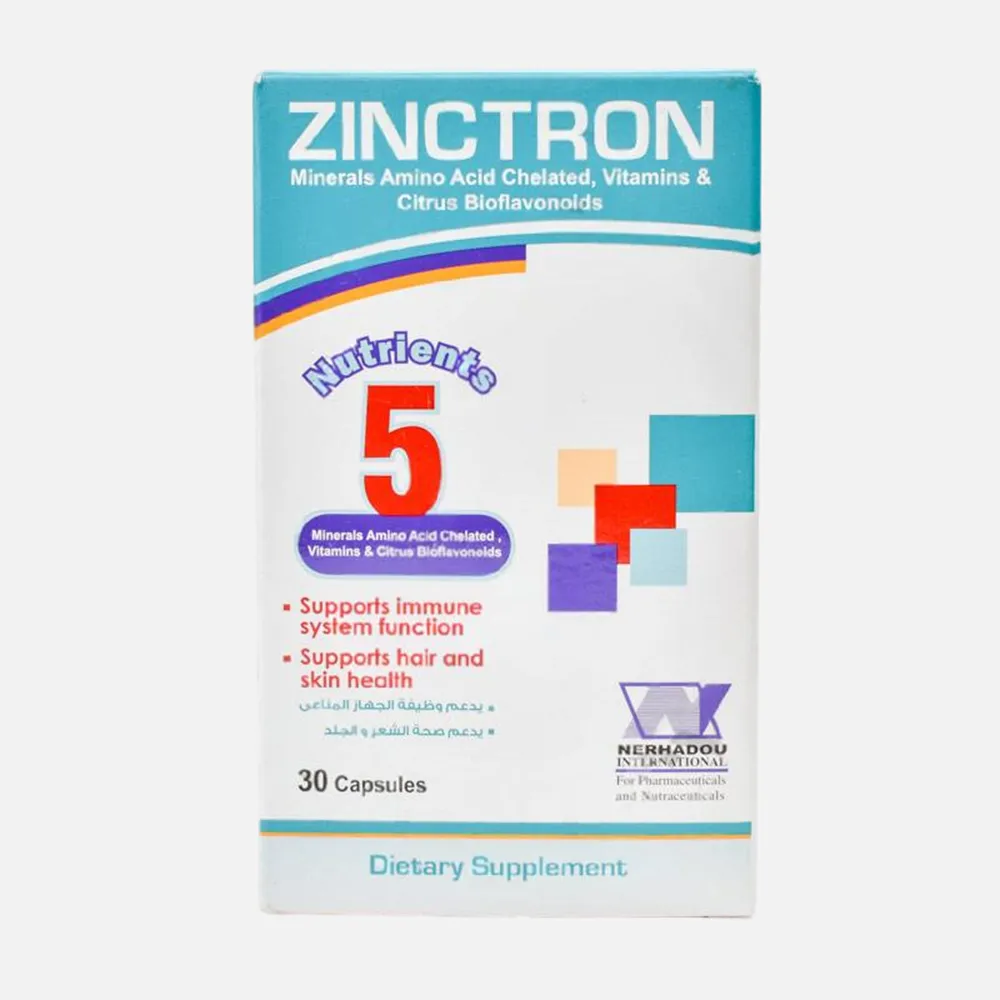 زنكترون Zinctron 30 كبسولة مكمل غذائي يدعم صحة الشعر والبشرة والأظافر للرجال والنساء، ويساعد على تعويض نقص الزنك ودعم المناعة.